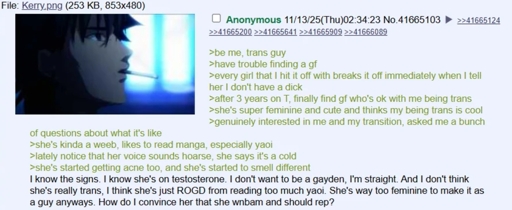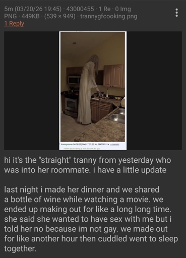 OntologicalFate · 16 days agoanon makes out with roommate for 2 hours but doesn't have sex with her because she's not gayplus-squareimagemessage-square2linkfedilinkarrow-up19arrow-down10