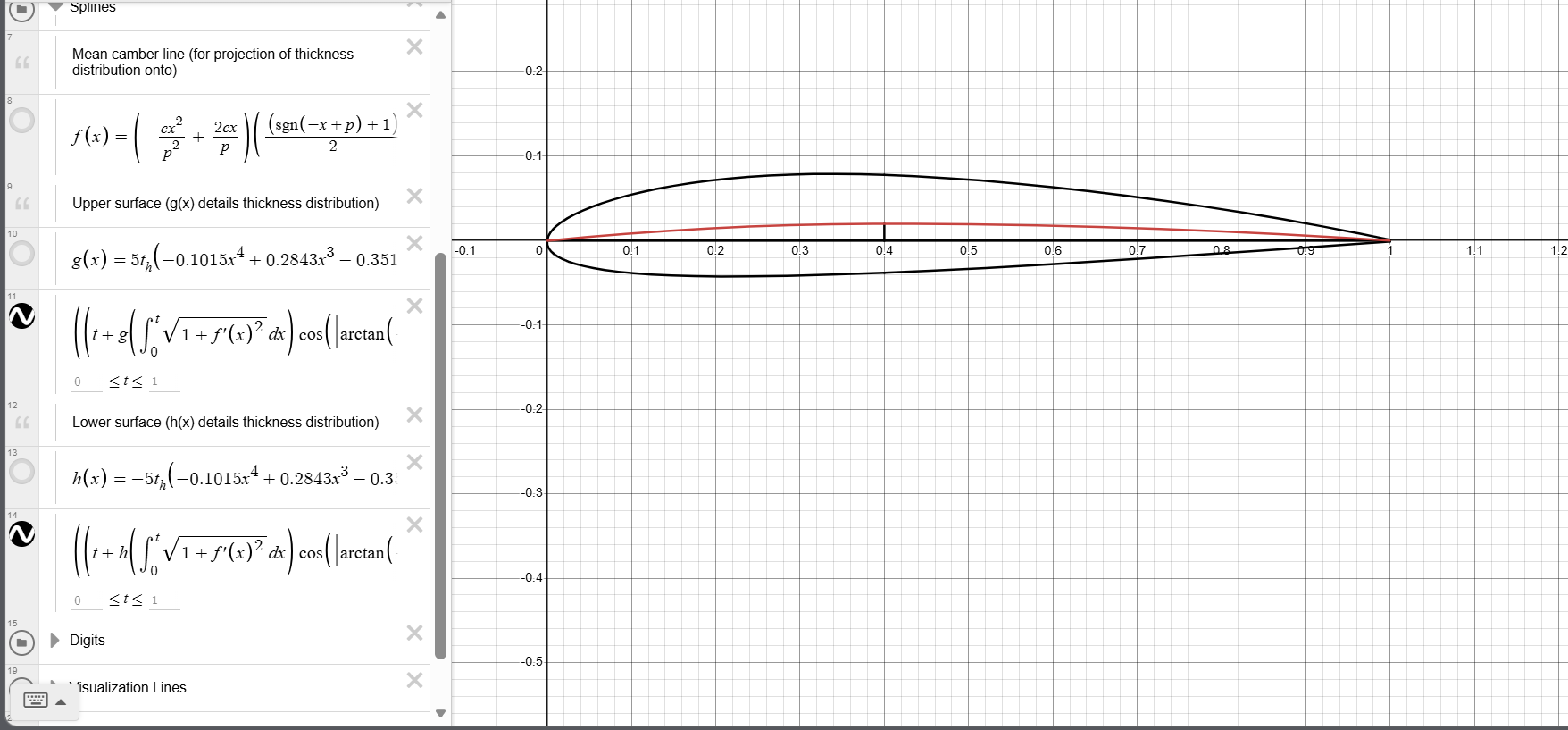 The camber line is the line of loci of each point of the bottom & top surfaces of the foil, so it’s called the ‘mean line’ too. I forgot how I graphed it but I’m pretty sure I used the equation of a spline …