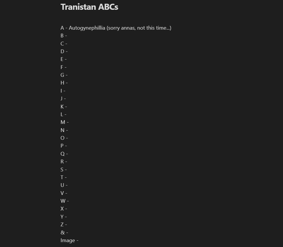 Winner for the letter A was obviously autogynephillia… annas was close but sadly, AGP is too strong.