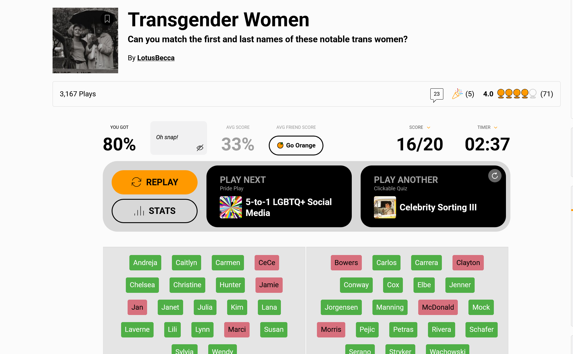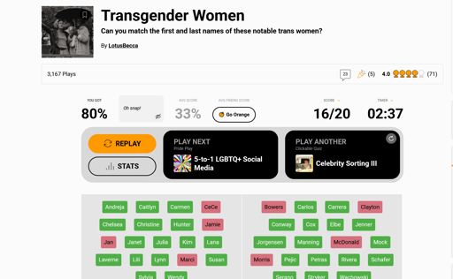 https://www.sporcle.com/games/LotusBecca/transgender-women if you think you can beat me