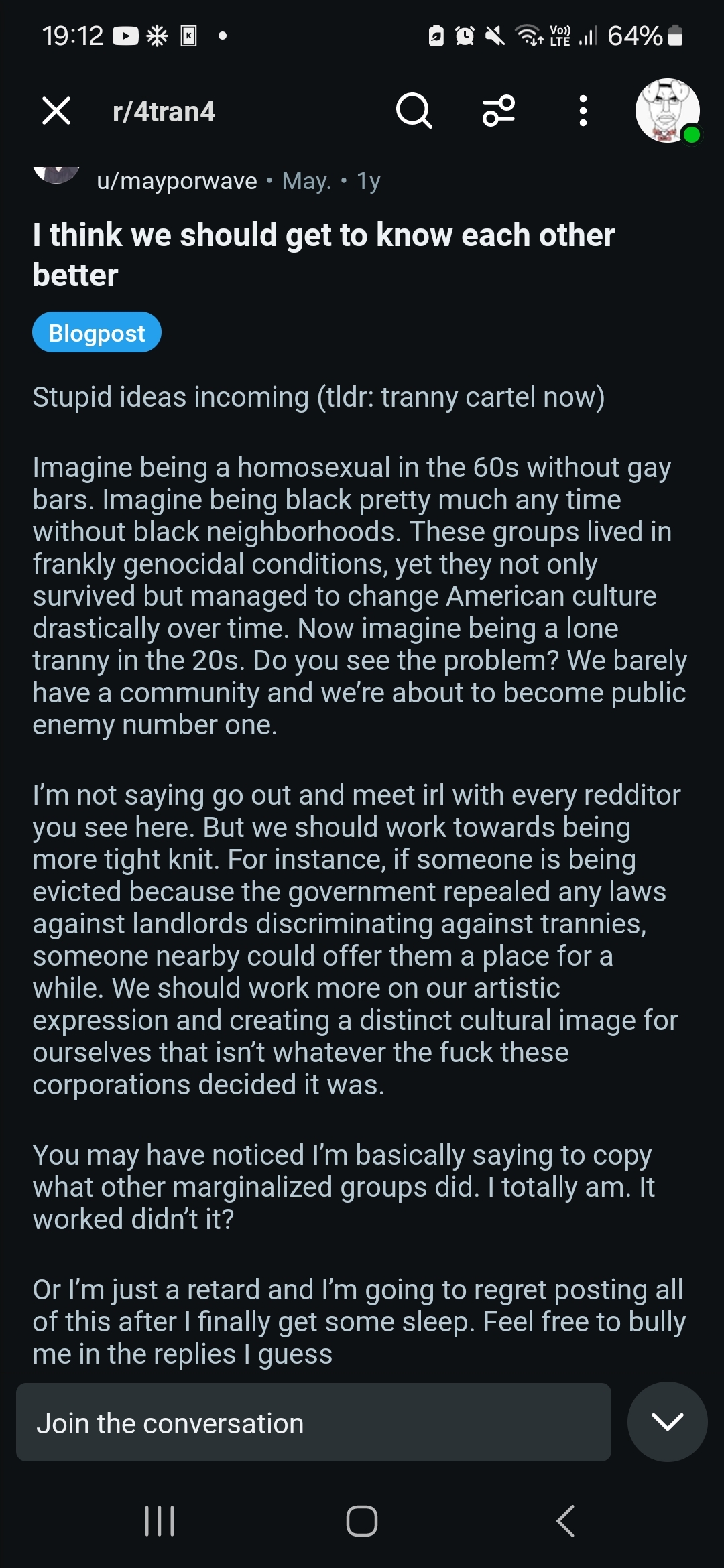 Normie Trannies have been brainwashed into thinking they don’t need HRT and self-respect by cis society, so when we create our own groups this CAN and WILL be undone.