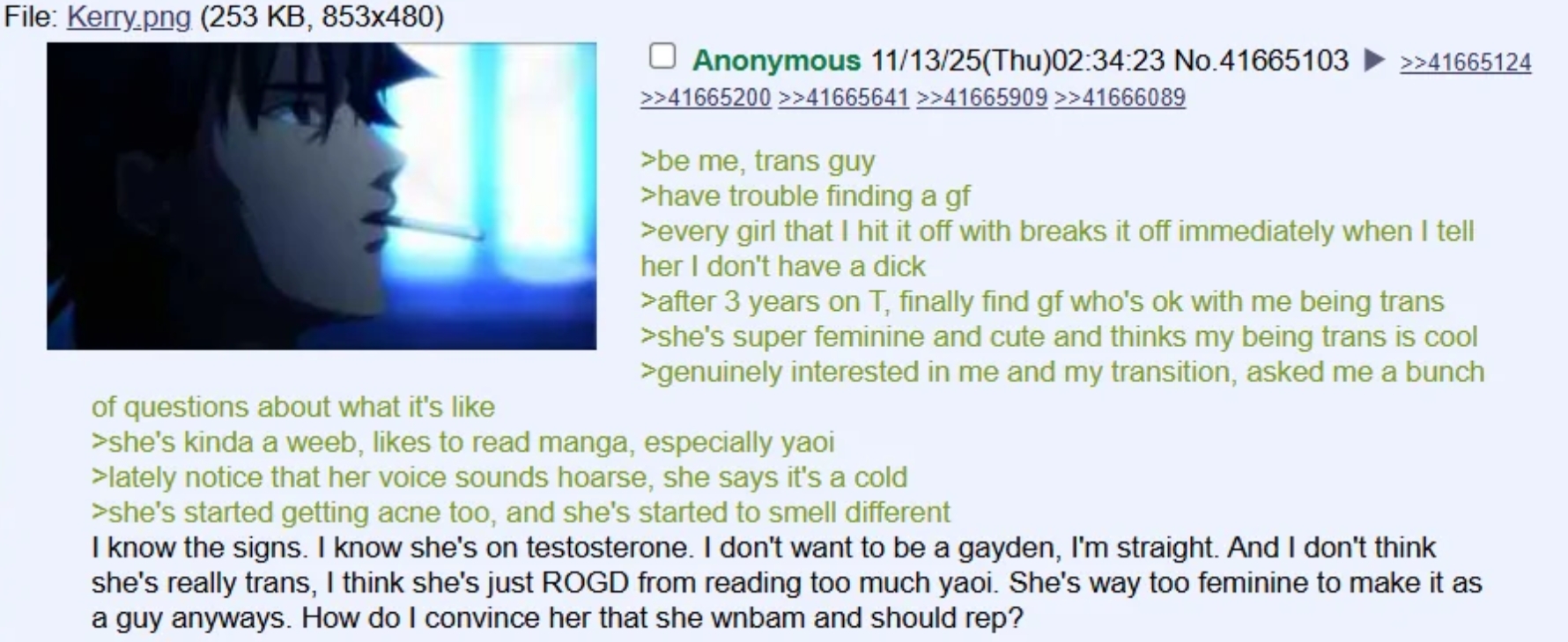 So the gf (or I guess bf) gets into a relationship with a straight man and transitions in secret from him. Meanwhile the straight (trans) man unironically used the term ROGD and wants to convince his partner into repping without even discussing the matter with them beforehand.