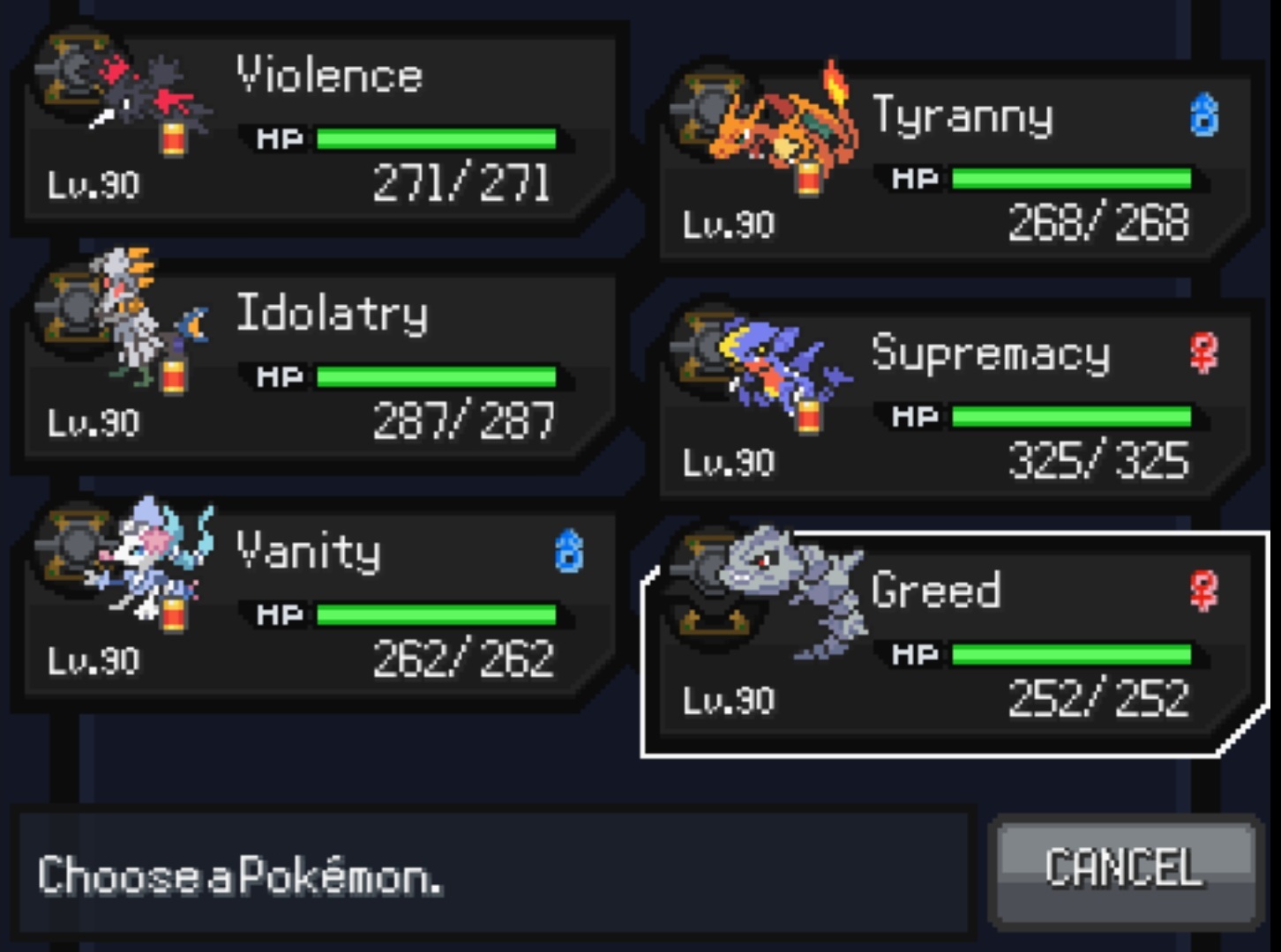 This is my team from Pokemon Rejuvenation, more specifically, the team I used while doing the “renegade route”, = genocide route in tobey fox language.