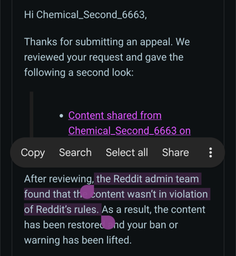 in my appeal i merely stated that the only thing they’re doing with this is demonizing our speech to have an excuse to cut us off from our communities and make our lives more miserable and they literally unbanned me not an hour later. Disgusting reptilian pedophiles. They only want you to feel watched, threatened, defenseless against their power.