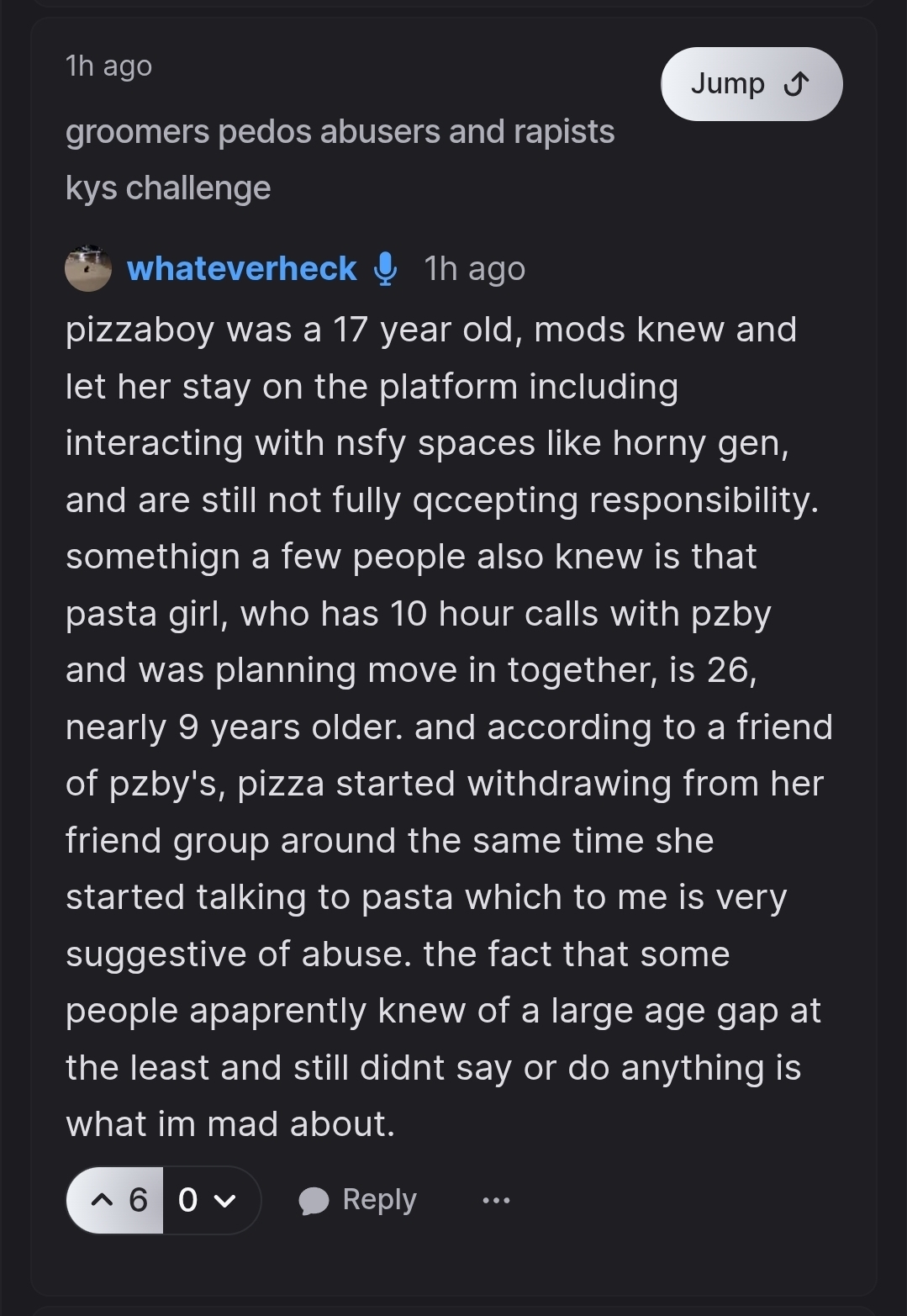and sandwich got banned for calling the mods out,and someone uploaded screenshots showing pizza had been groomed before and was vulnerable