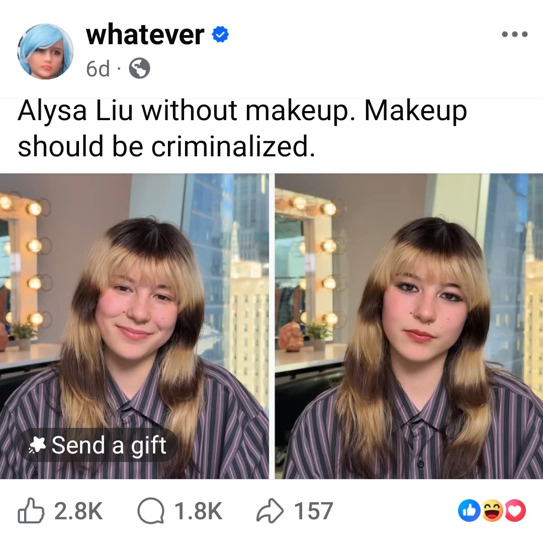 she is obv beautiful both ways however i am the kind of man makeup was made for i would not know she was wearing anything beyond her eyes lmao