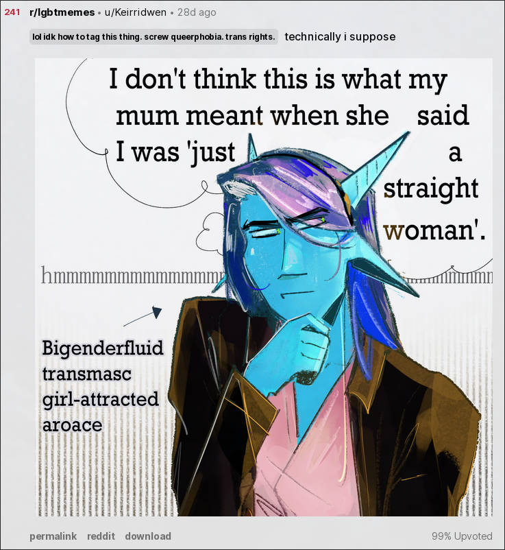 aroace but girl attracted, trans masc but gender fluid, truly incredible