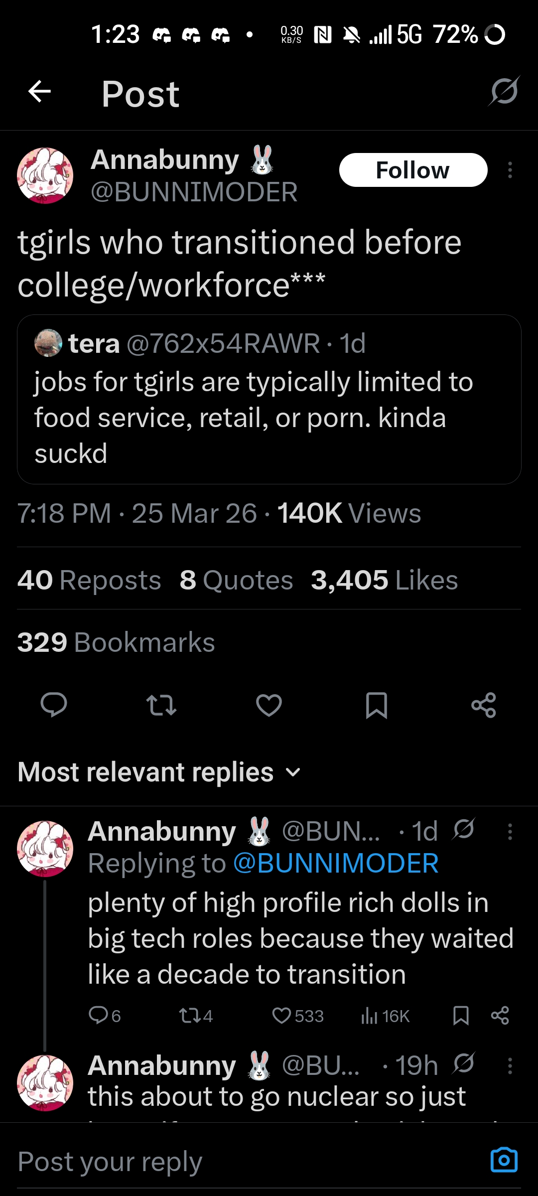 From her replies in the comments it very much seems she’s advocating you wait to transition and if you disagree you should explode