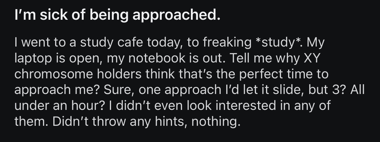 I mean ig… And yeah it’s probably not w the transphobia in mind but still this post reeks of bitchiness and humble bragging, could’ve been just “men approach me in inappropriate situations” or whatever