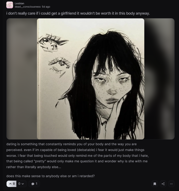 same lol. don’t think im really mature enough or am in a good mental space for a relationship rn. being a tranny also doesnt help. i wrote a post about it before: