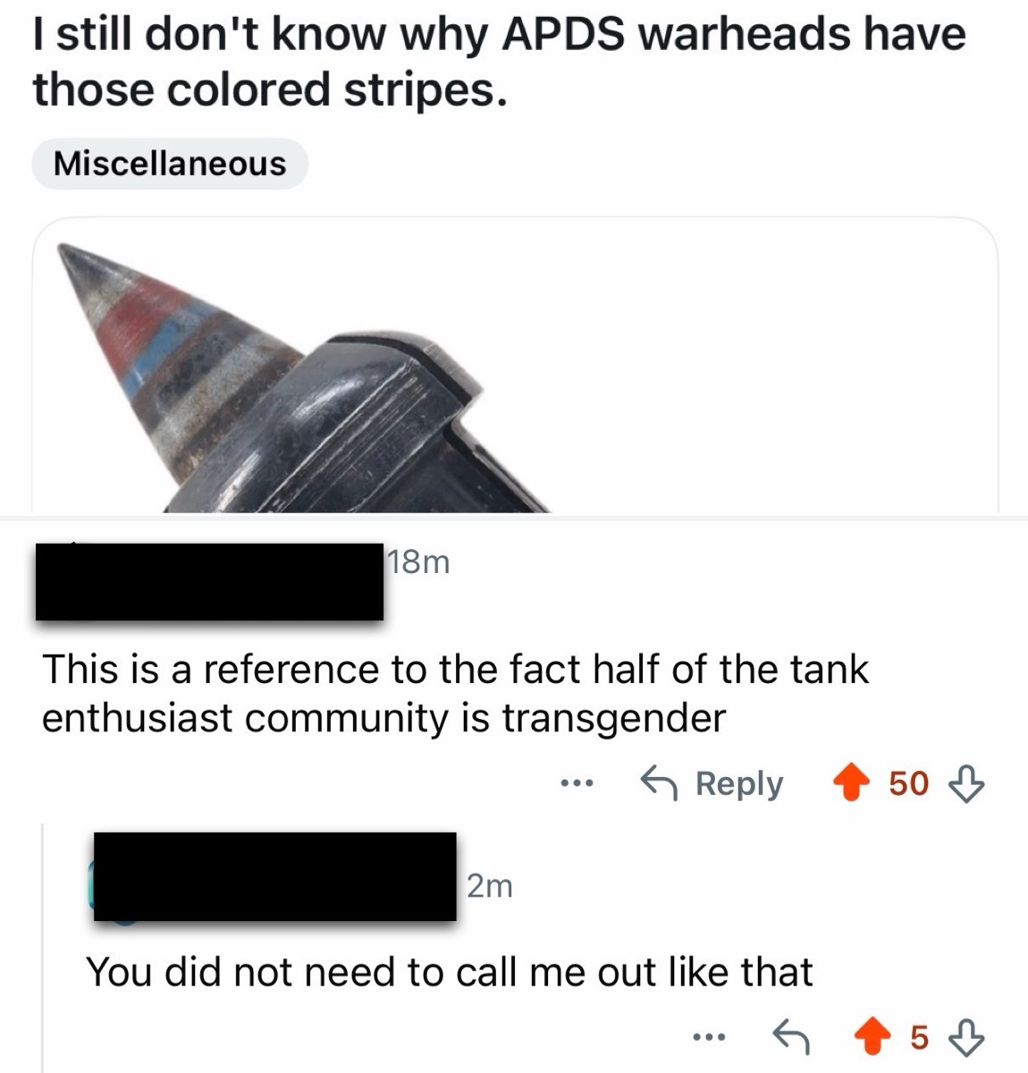 I’m sorry but wdym tank? Like a tank in war? And why would that be a trans thing??? I don’t get it
