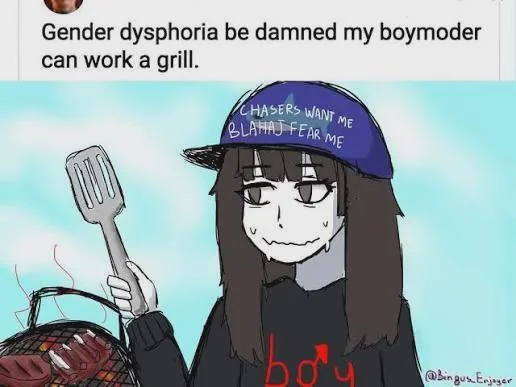 I gave advice to my sisters friend about how to grill some hotdogs and burgers today. Gotta be the sneediest thing I have ever said but I unironically want to make this joke in real life one day (not the boymoder part I am a man probably with depression/anxiety of lost youth likely misconstrued as gender dysphoria).