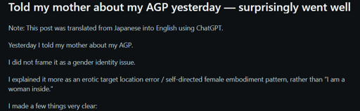 That subreddit is so strange, i must confess I’ve occasionally considered self-ID’ing as an Autogynephilic Male, Anne Lawrence style, but I can’t separate the terms and ideas surrounding AGP from its transphobic genesis and use