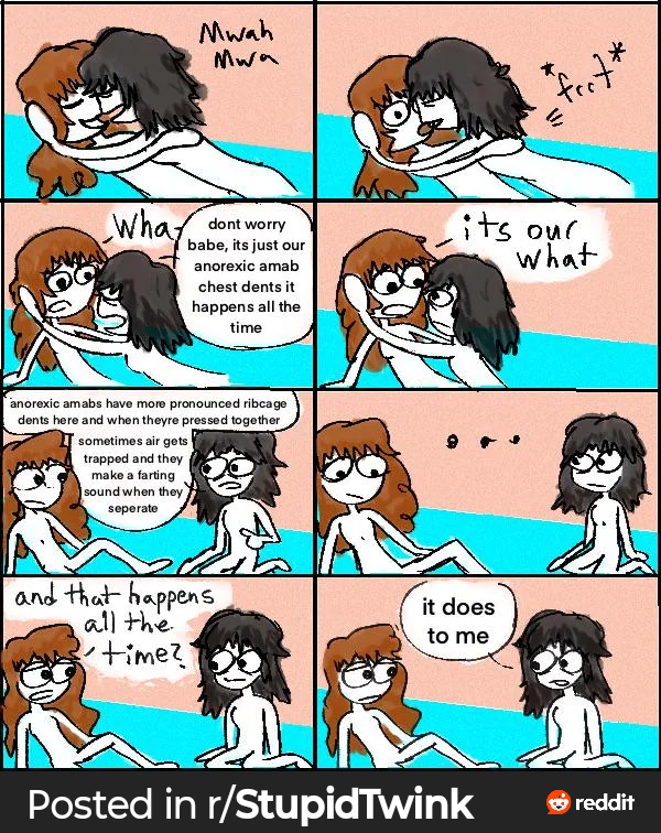 Due to the shape of the ribs, AMAB people have a slight depression between their chest and abdomen; if you are very thin, this depression becomes quite noticeable… And yes, it does make a fart sound when its pressed against another chest.