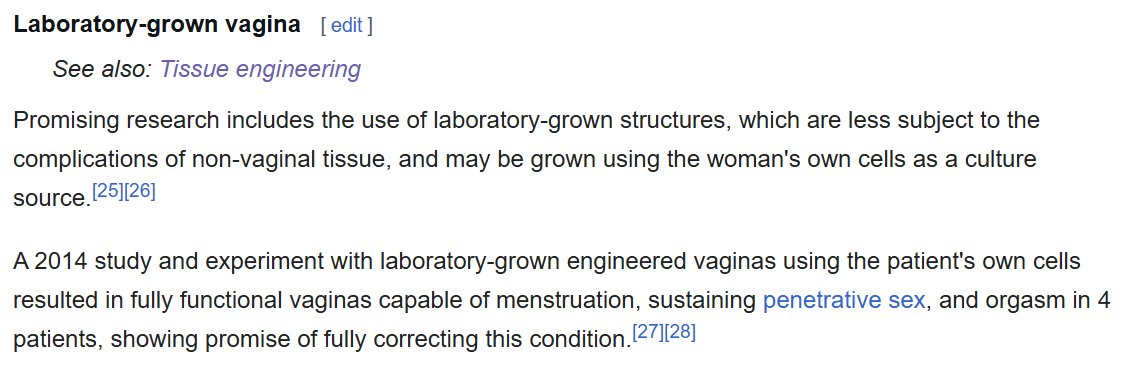 https://en.wikipedia.org/wiki/Müllerian_agenesis#Laboratory-grown_vagina https://www.newscientist.com/article/dn25399-engineered-vaginas-grown-in-women-for-the-first-time/