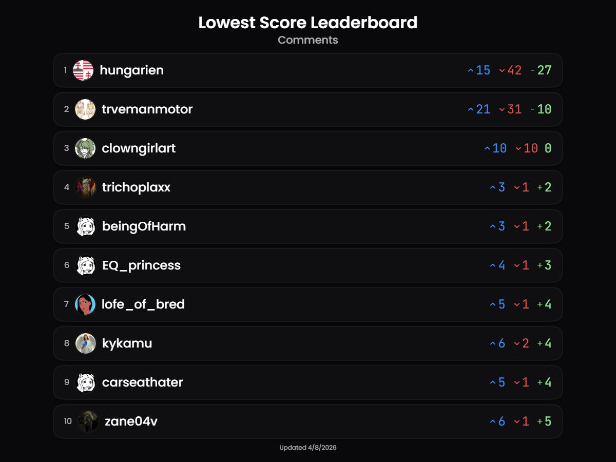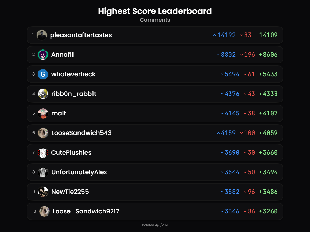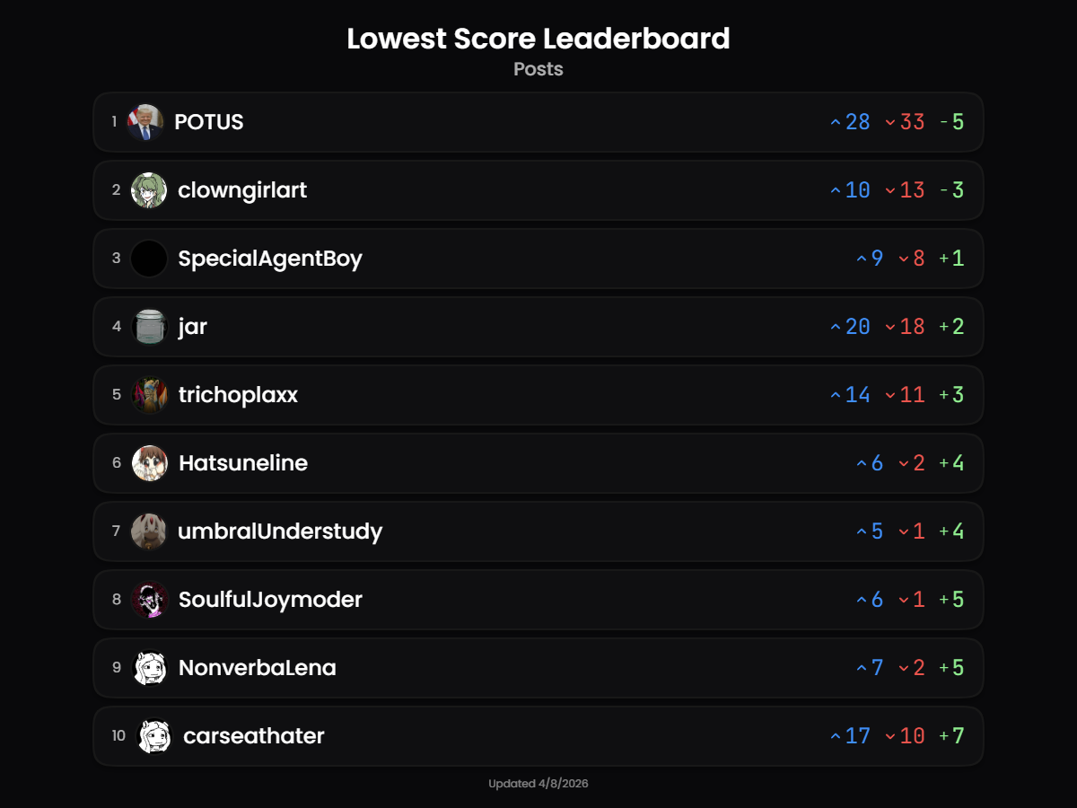 Good info I think but shouldn’t the post leaderboard have how many posts someone made? Instead of just where ppl rank