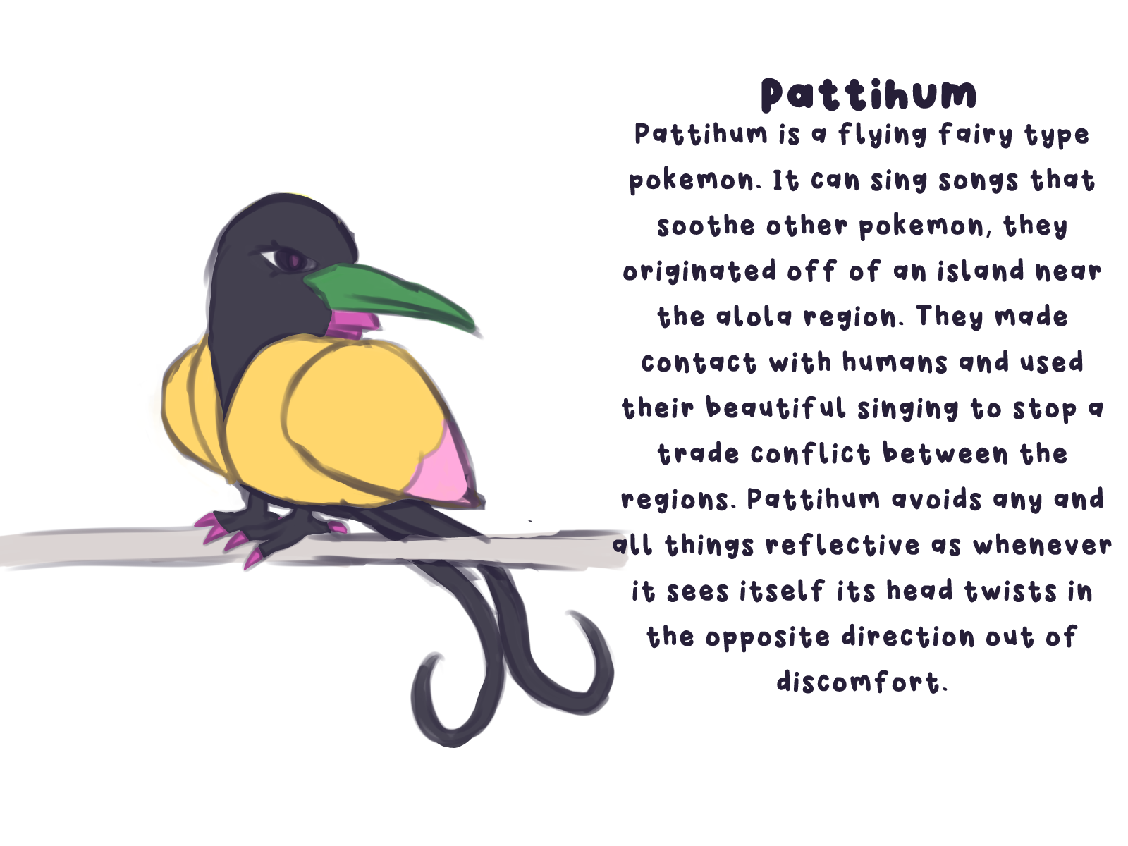 I LOVE IT!!! THE ART IS AMAZING THE DESCRIPTION IS AMAZING (AND KINDA FUNNY) AND THIS IS THE BEST ART SOMEBODY DREW FOR ME EVER!!! NOW I’M GONNA DRAW THIS POKEMON!!!