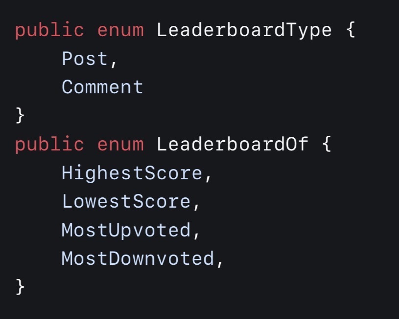 very cool, you need a trailing comma for LeaderboardType.Comment tho