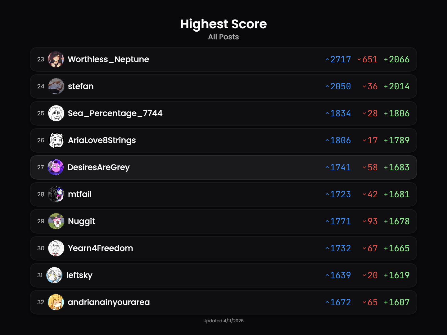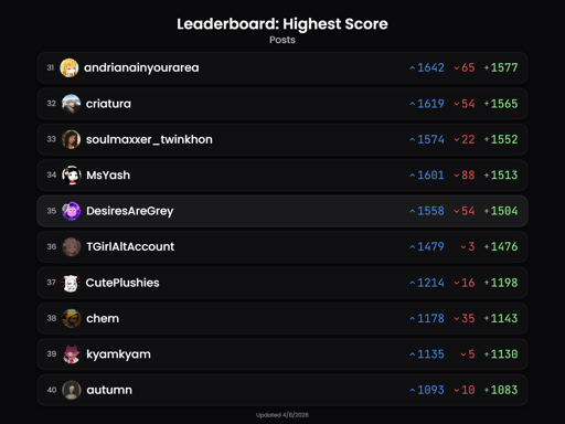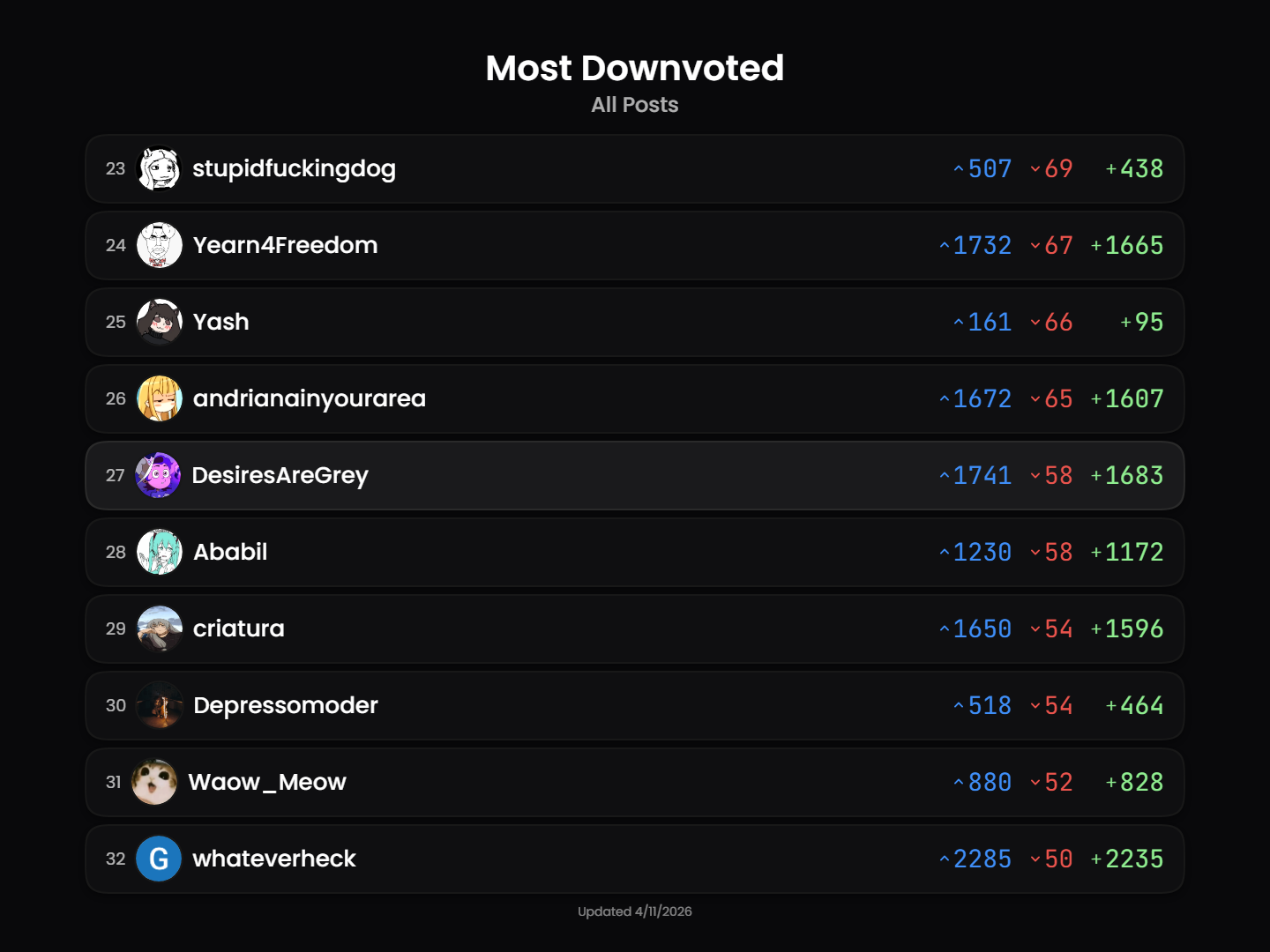 https://api.desiresaregrey.com/tranistan/leaderboard.png?of=MostDownvoted&username=DesiresAreGrey