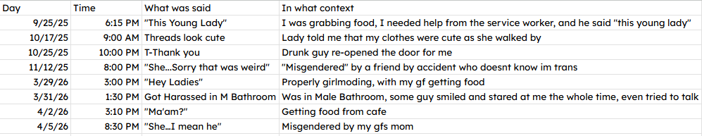 I never get that at all. Yeah, I only ever boymode, but still. I know a lot of cis male metalheads who malefail sometimes just because of their long hair and because they are not ogres (not 6ft+)
