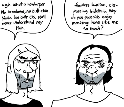 im not talking about hugboxing., im talking about people on here who’ll complain about being unable to boymode because how well they pass and stuff like that, not a different person telling them they pass. passoid humblebraggers who are spiritually cis (and therefore should be included in tcd)