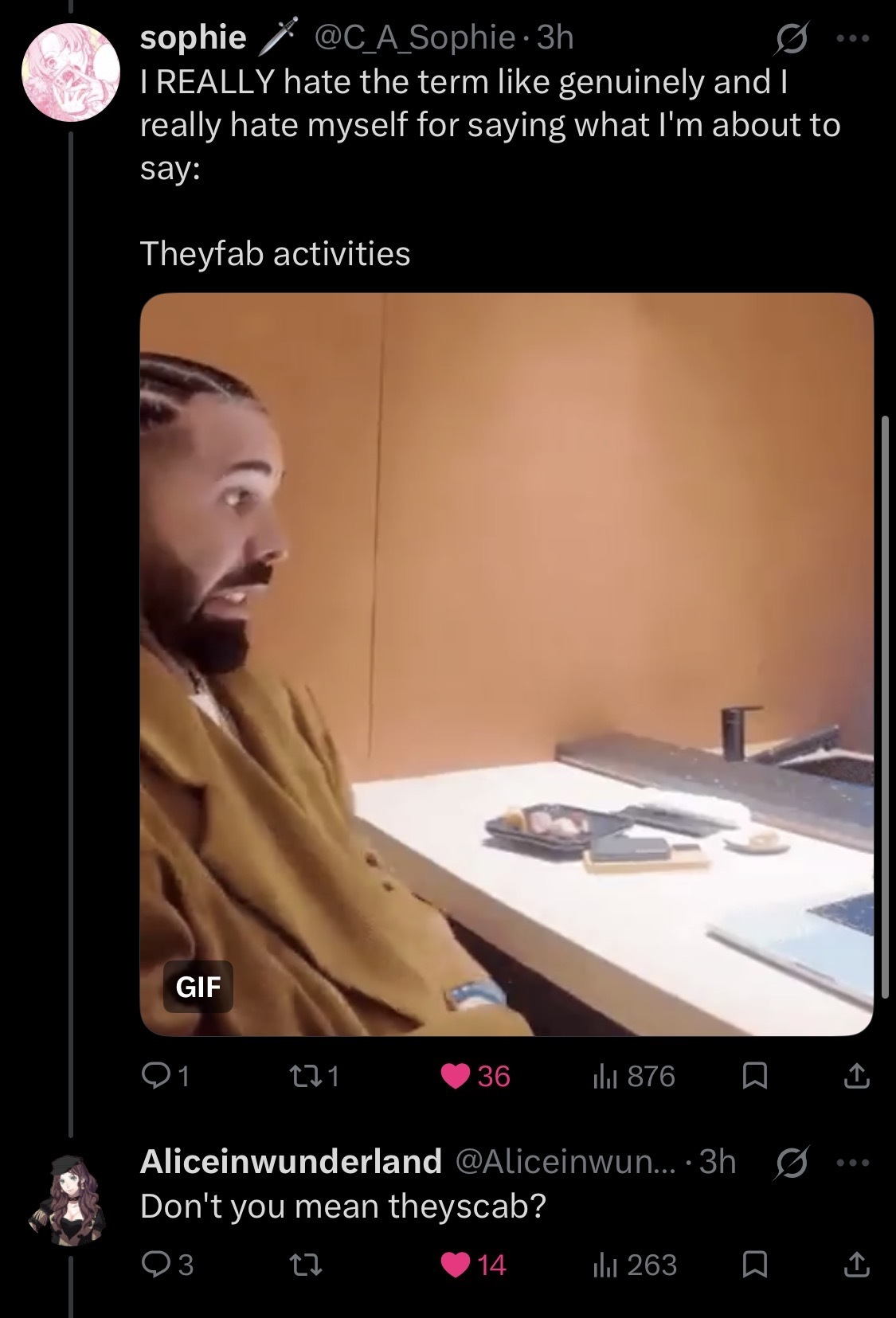 Theyscab = theyfab who, like a scab, sells out trannies and actively Does Not Care about the oppression actual trannies (especially us TMA) face as long as cissoids support them and their fellow AFAB non-transitioning non-dysphoric non-binaries.