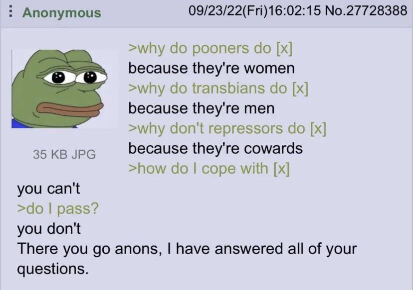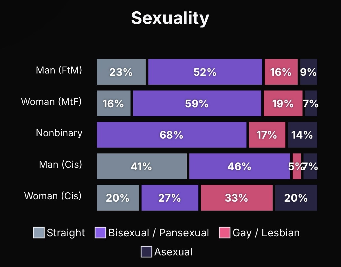 in general, it feels like 90%+ of trans women online are lesbians, but 4tran probably has one of the bigger ratios of straight trans women.