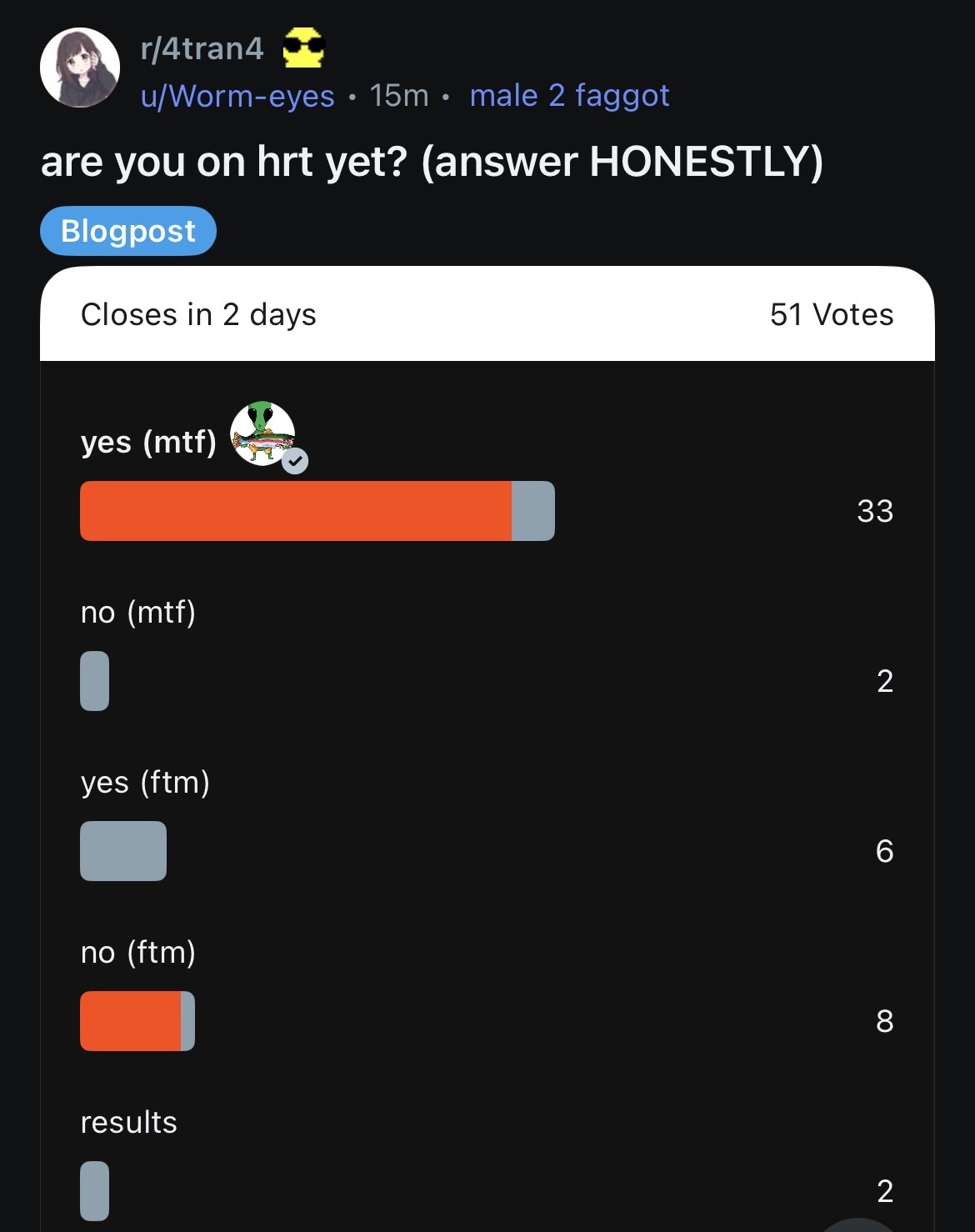 wormeyes to 4tran4 · 1 day agointeresting poll results...imagemessage-square11linkfedilinkarrow-up19arrow-down10