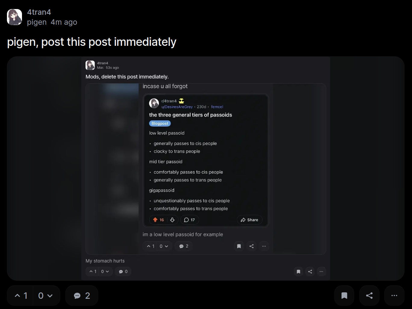 nowhere girl to 4tran4 · 2 hours agoPost, mods this delete instantlyimagemessage-square3linkfedilinkarrow-up13arrow-down10