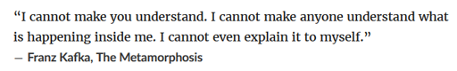 its the process of being put on trial for a crime you never learn the name of. the metamorphosis into a disgusting creature without explaining or warning. a labyrinth of bureaucracy, with endless hallways, closed doors, and unhelpful officials.