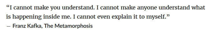 our lives are an absurdity, a trial without a crime but with a sentance of death, an unwilling metamorphosis into a monstrous form, and all while the bureaucracy of the world does everything in its power to lock us away from any minute relief we can get for this pain, no matter how much we scream and beg for mercy.
