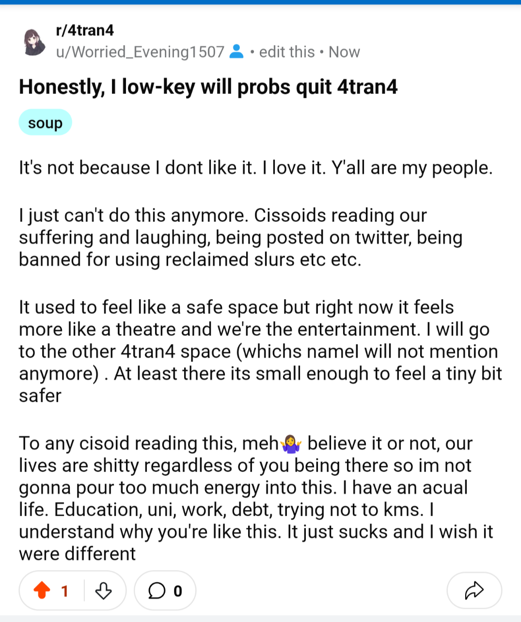 I was already thinking about quitting reddit 4tran4 but I was unsure. Then the twitter incident happend. 2 hours later, some cisoid femcel posted an AMA on 4tran4 reddit. That was the last straw. It makes me sad but 4tran4 was claimed by the cissoids