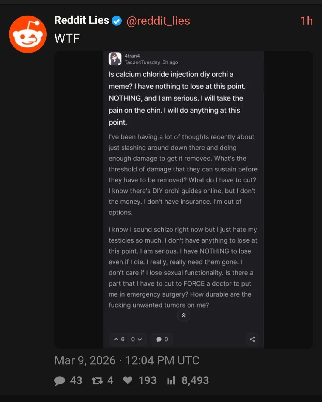 I’ve been having a lot of thoughts recently about just slashing around down there and doing enough damage to get it removed. What’s the threshold of damage that they can sustain before they have to be removed? What do I have to cut? I know there’s DIY orchi guides online, but I don’t the money. I don’t have insurance. I’m out of options.