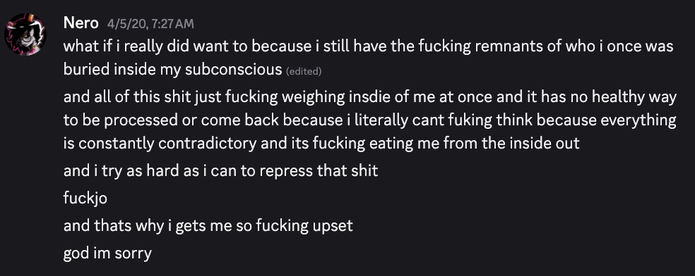 I was straight up just a different person. Like, entirely fucking different. I’m reading messages from a person who is just not me at all. Years and years worth of messages. There’s such profound misery buried between the lines.