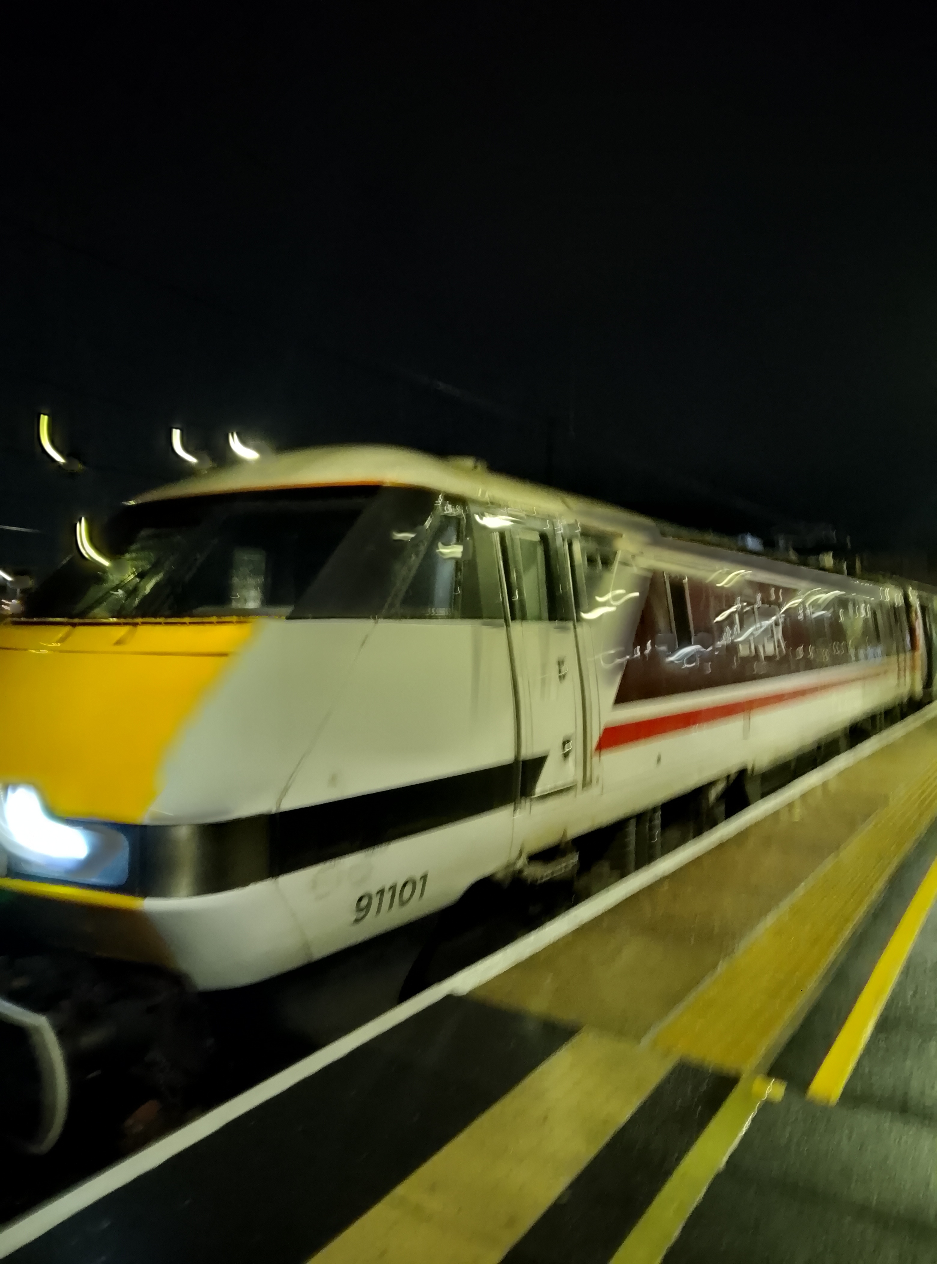 Earlier this week, I had a late night journey on the East Coast Main Line, travelling between northwards from Peterborough. It is a route I have done many times before with the London and North Eastern Railway (LNER) services. On almost all of those occasions, this has been on Azuma Class 800 units. However, this night instead it was an old Class 91 electric locomotive (a.k.a Intercity 225), built in the 1980s at the famous Crewe British Rail works, that pulled into the platform. I took a shitty blurry photo before getting on.