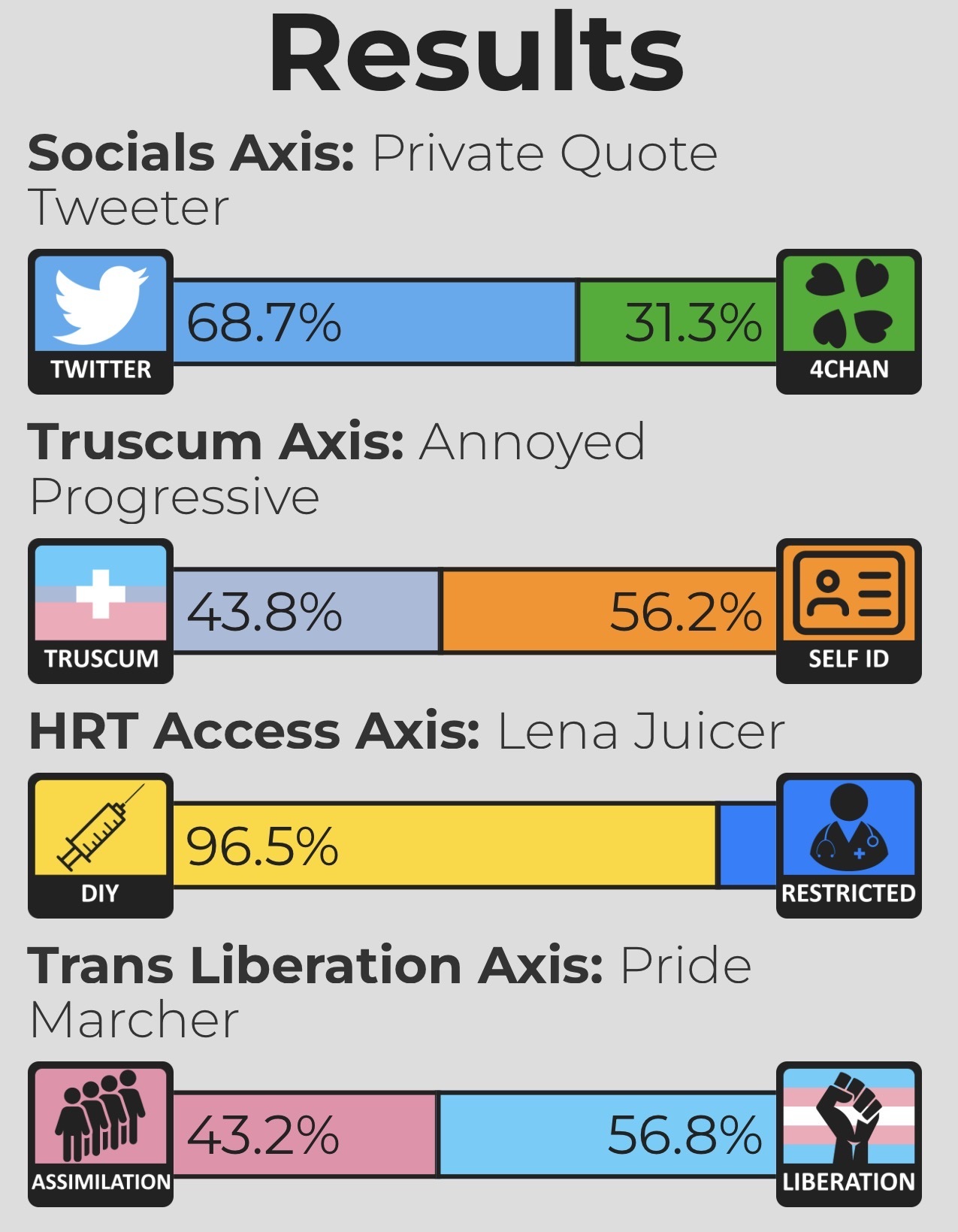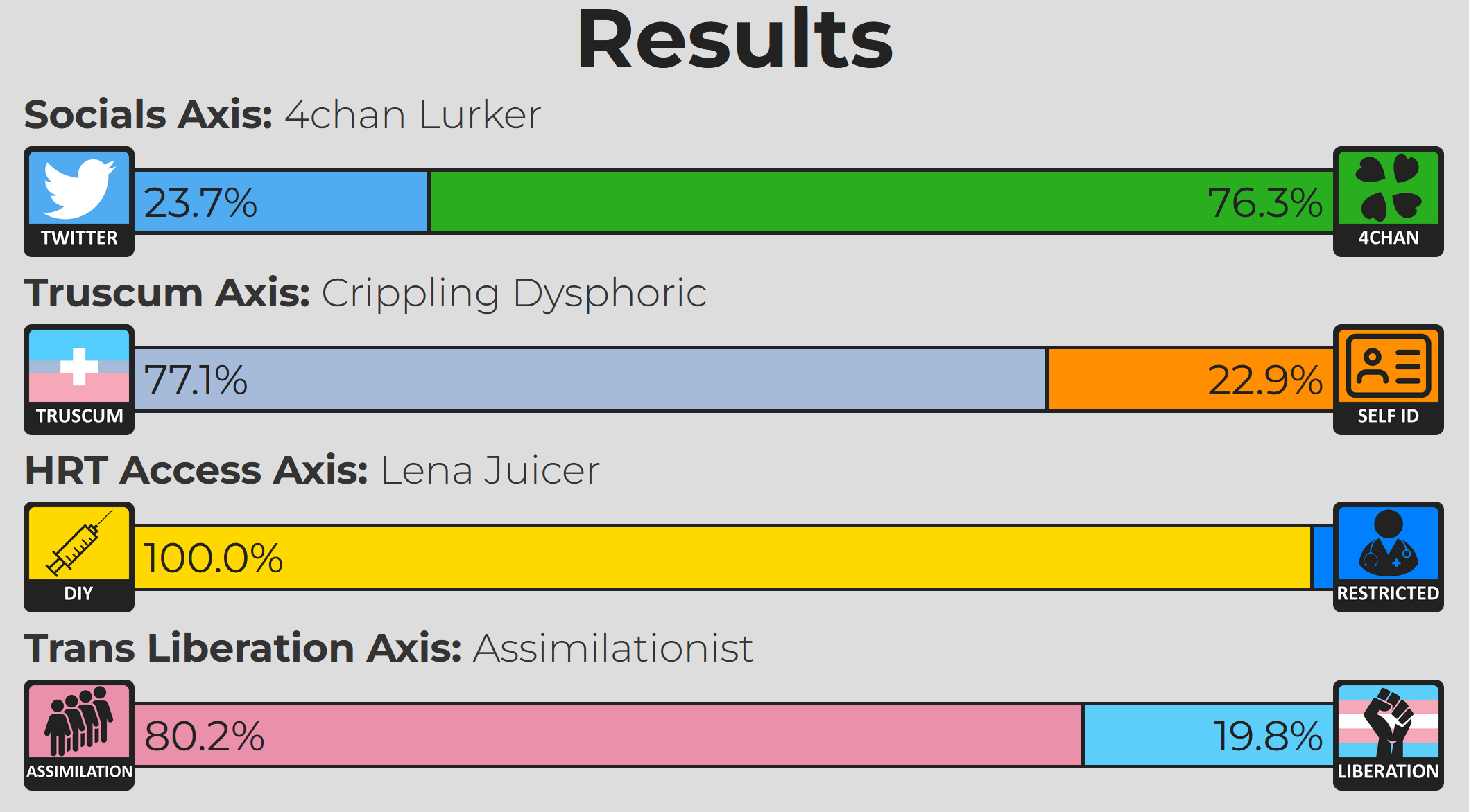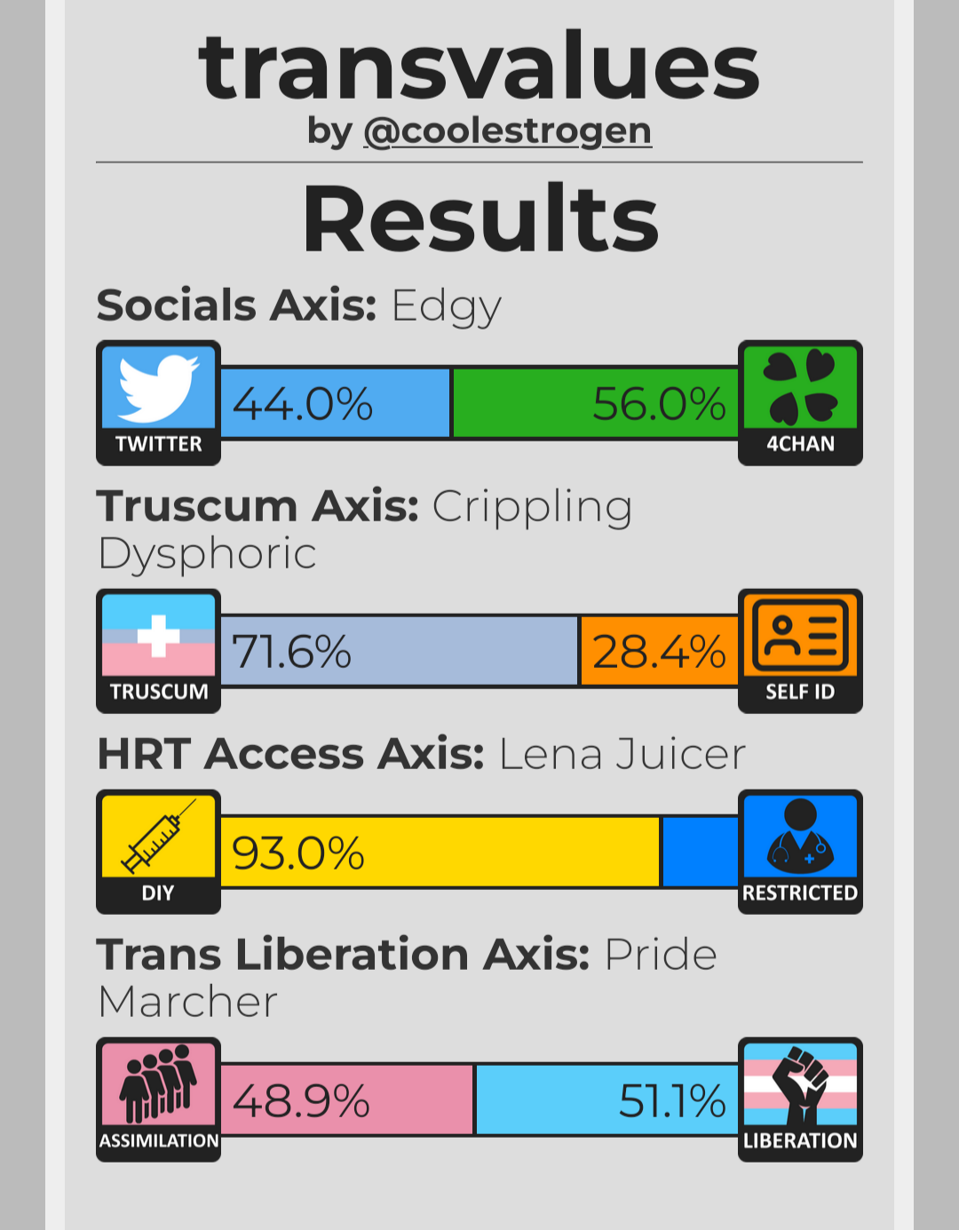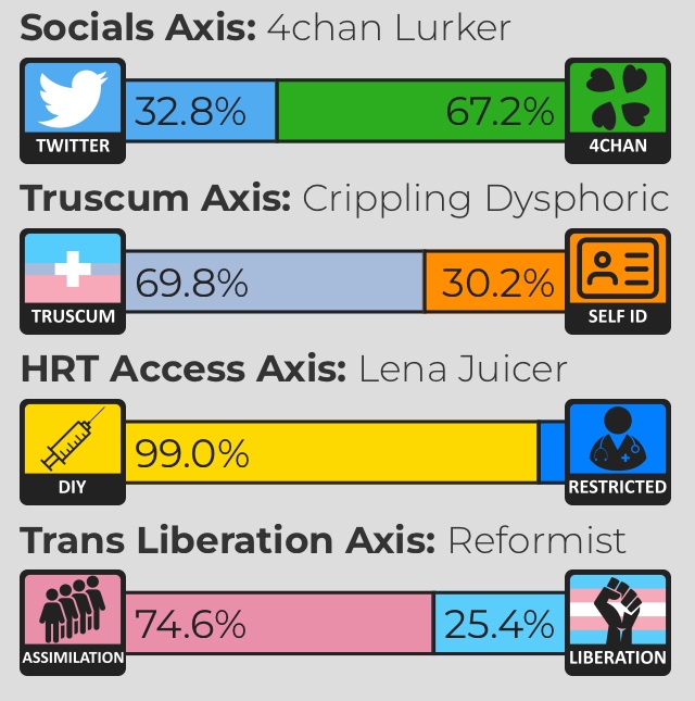 60% to 95% 4chan, 60% to 95% truscum, 90% to 100% DIY, and 50% to 95% assimilation