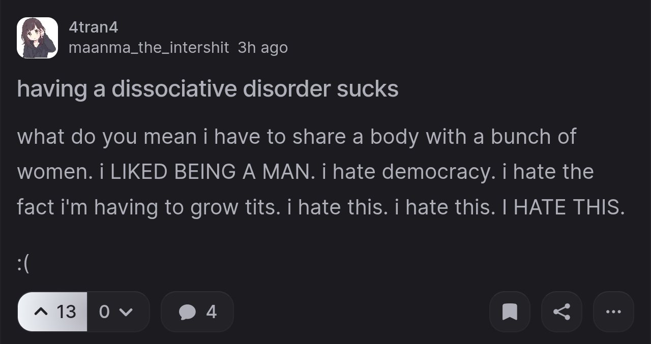 tcd idc if he’s being forcibly transitioned by the rest of us HE’S THE ONLY MAN IN THIS FUCKING BODY AND HE CAN LEARN TO DEAL WITH IT LIKE WE HAD TO DEAL WITH DYSPHORIA FOR YEARS