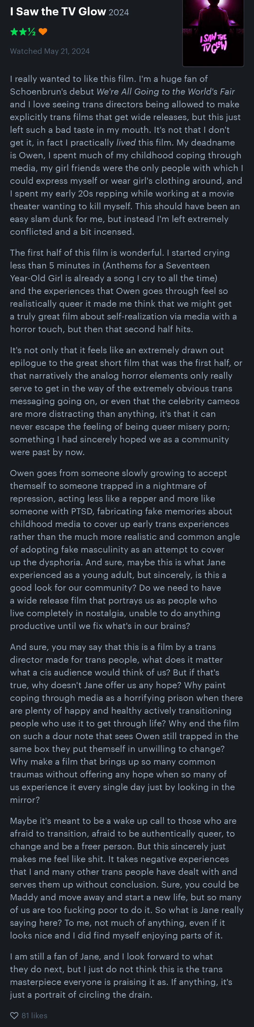i would love to see the full review of i saw the tv glow i also wanted to like it but seemed too milquetoast and on your face and lowk boring