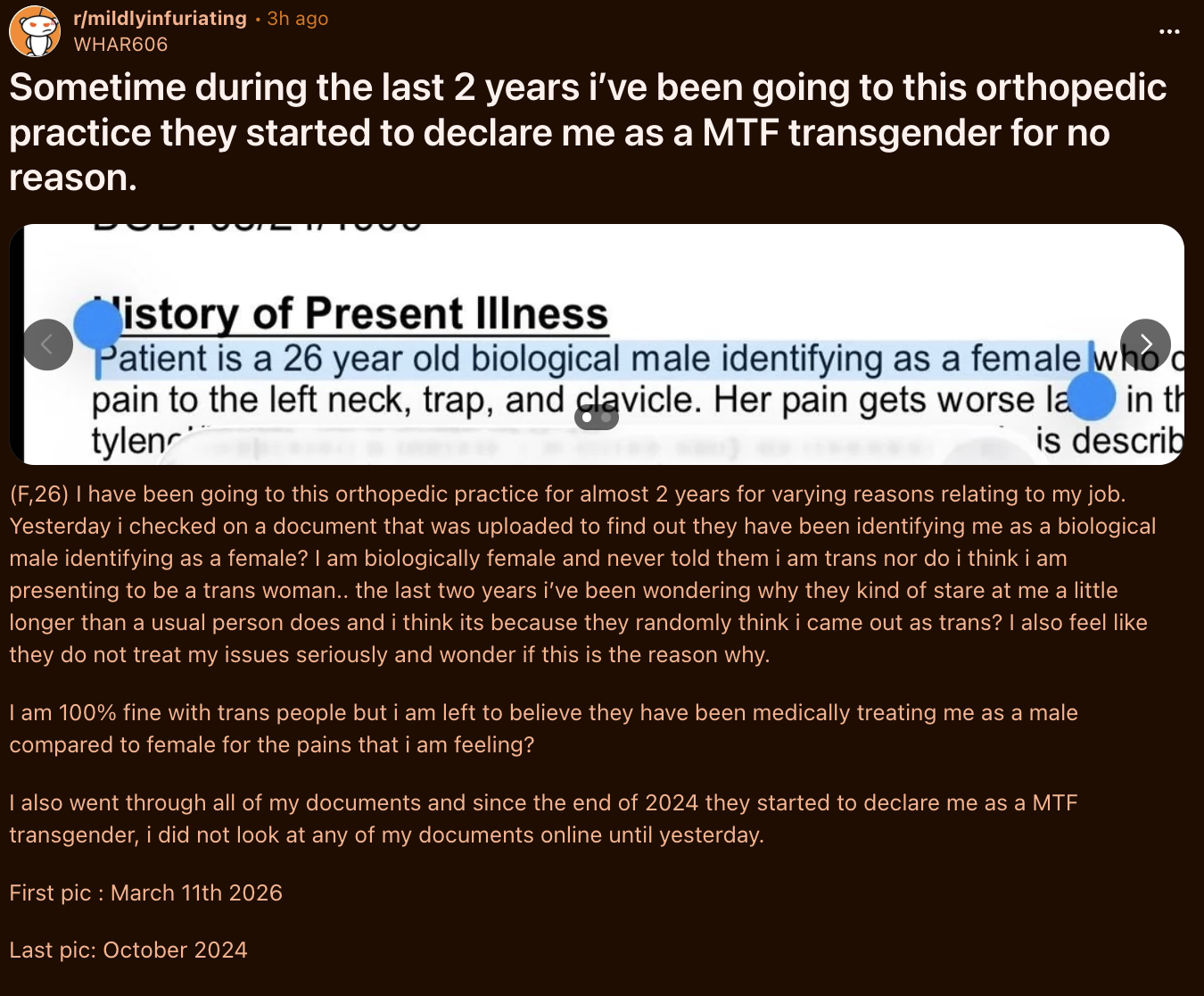 I have a trans female friend who constantly gets misgendered and deadnamed at her doctors office even though she told them shes mtf. hahahahaha, really sucks for her. haha, anyways that was just a funny little anecdote I like to tell everyone.