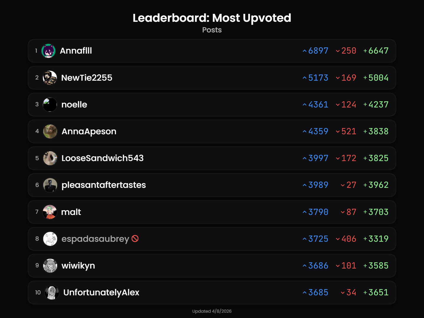 "person_view": { "person": { "id": 222, "name": "UnfortunatelyAlex", "avatar": "https://tranistan.com/pictrs/image/9e3ef73f-8893-428f-9ab6-418ac0e9748a.jpeg", "banner": "https://tranistan.com/pictrs/image/2e07ea28-9891-42f7-b137-f680f8518254.webp", "published": "2026-03-01T13:37:51.138415Z", "bot_account": false, "banned": false, "local": true, "deleted": false }, "counts": { "post_count": 347, "comment_count": 1481 }, "is_admin": false },```